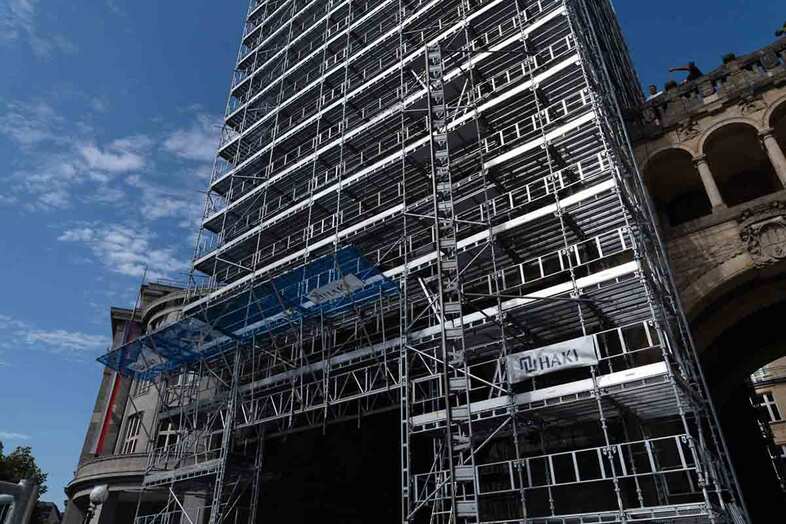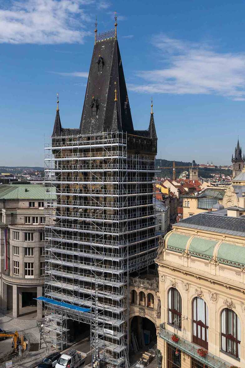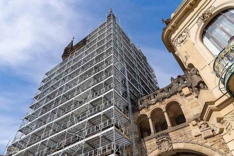 Ställningskonstruktionen för restaureringsarbetena på en sådan ikonisk byggnad innebar en del utmaningar. Den utsmyckade fasaden innehåller många dekorativa böhmiska statyer och emblem, vilket gjorde det extra komplicerat att bygga byggnadsställningar runt den. Därför tog HAKI:s ingenjörsteam fram 3D-ritningar och beräkningar över byggnadsställningarna för att garantera säkerheten för alla involverade parter i restaureringen.