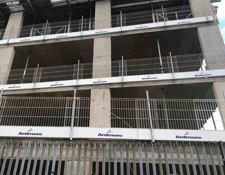Ett annat exempel på kundanpassat kantskydd är våra Catchfan-skyddsnät. Dessa kan beställas med stora nätbanderoller med egen varumärkesprofil, vilket är ett optimalt sätt att marknadsföra sitt varumärke på platser med mycket trafik.
