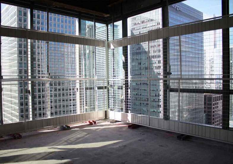 Systemet med kompressionsstolpar, som är idealiska för användning på betongstommar, skiljer sig från ovan installationer på grund av ökade vindlaster som uppstår när man installerar flera räckesnätspaneler på höjden.
