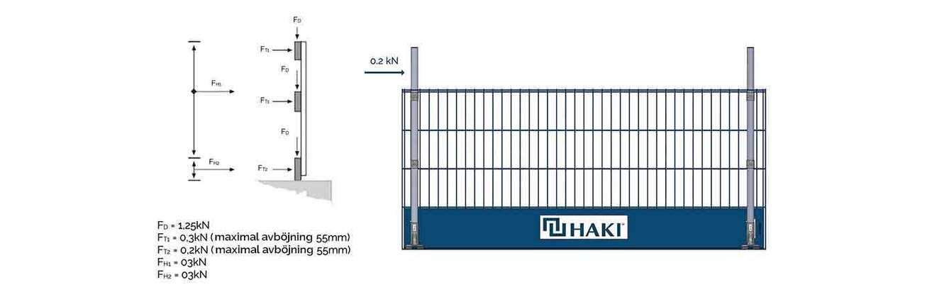 HAKI erbjuder ett brett sortiment av platta och vinklade, pulverlackerade räckesnätspaneler i stål som uppfyller SS-EN 13374-standarden. Det finns ett stort utbud av paneler i standard halvlängd (1300 mm), full längd (2600 mm) och överdelspaneler i samma längder, vilket ger en stor flexibilitet för platsspecifika behov och krav. HAKIs räckesnätspaneler uppfyller kriterierna för SS-EN13374 klass A, men Räckesnät Mk2 90° 2600 har även testats för klass B genom svingtest med sandsäck (låg dynamisk belastning) och klass C genom cylindertest (högdynamiskt test).